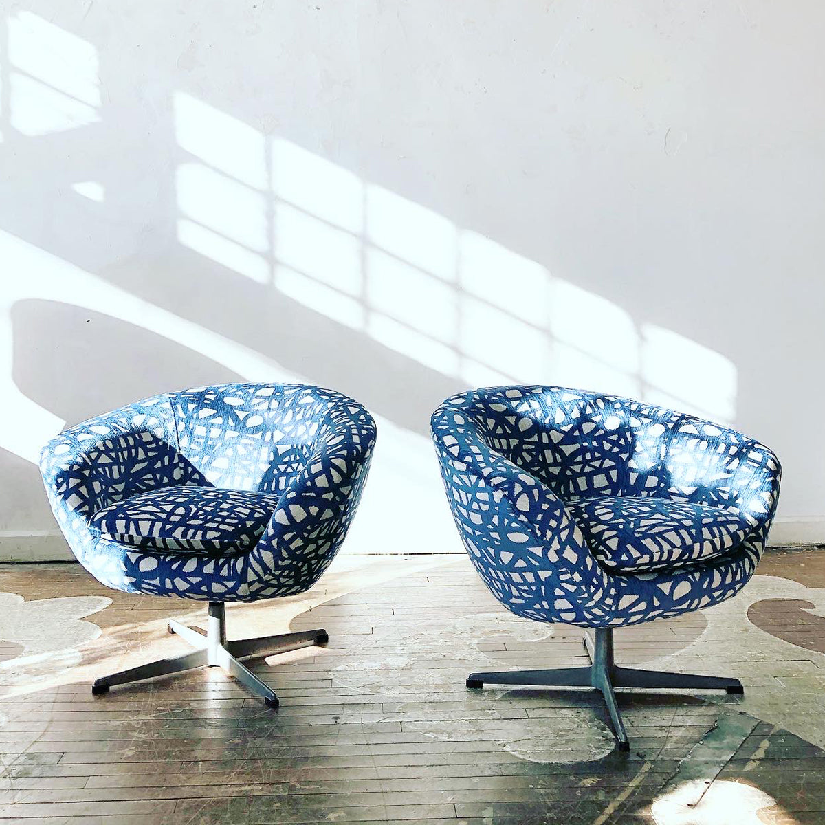 A pair of barrel back lounge chairs purchased at auction and reupholstered with Schumacher Momentum.