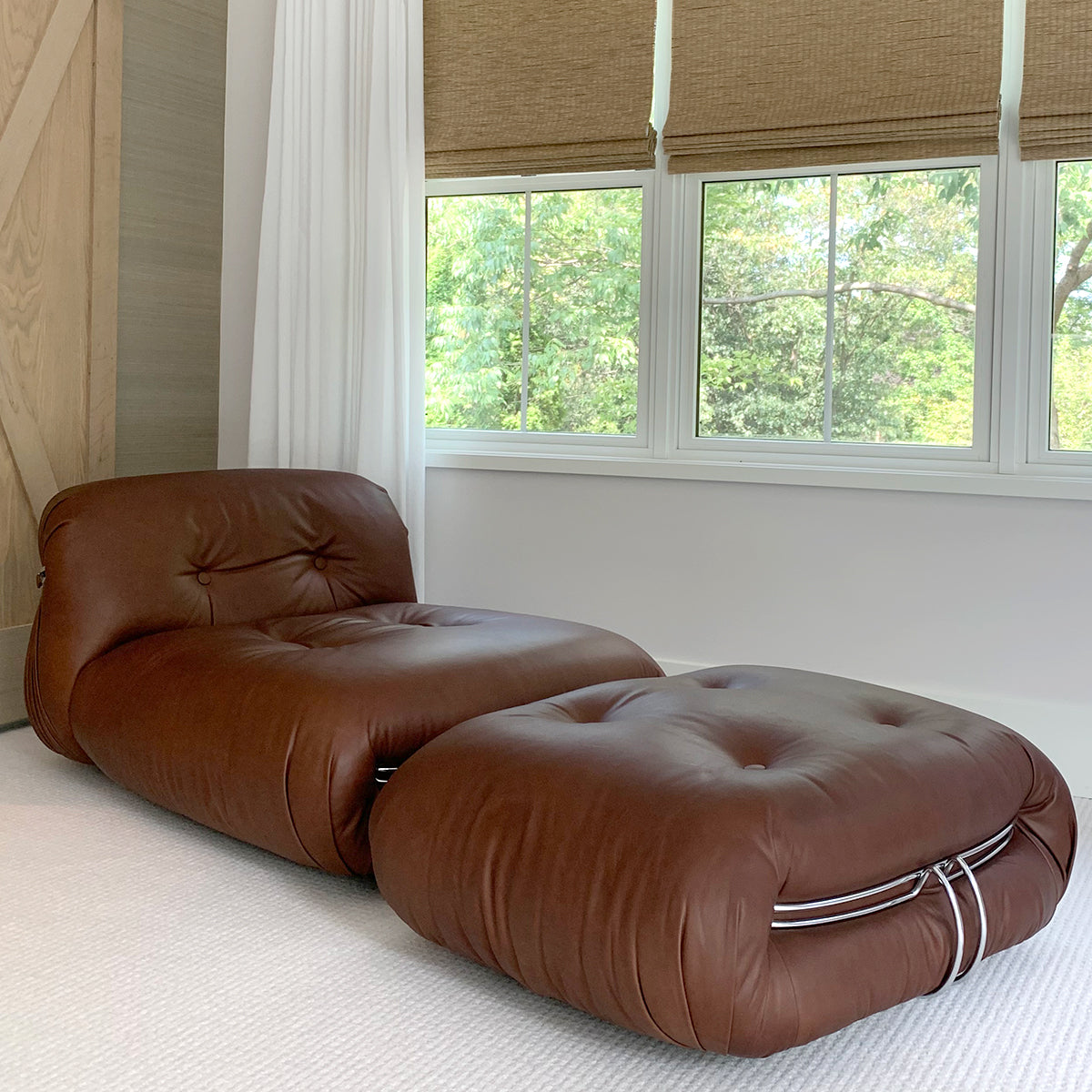 An inherited Tobia Scarpa Soriana Chair from Cassina circa 1974. This chair had been reupholstered in a cream fabric and we upholstered in Espresso leather from Moore & Giles.