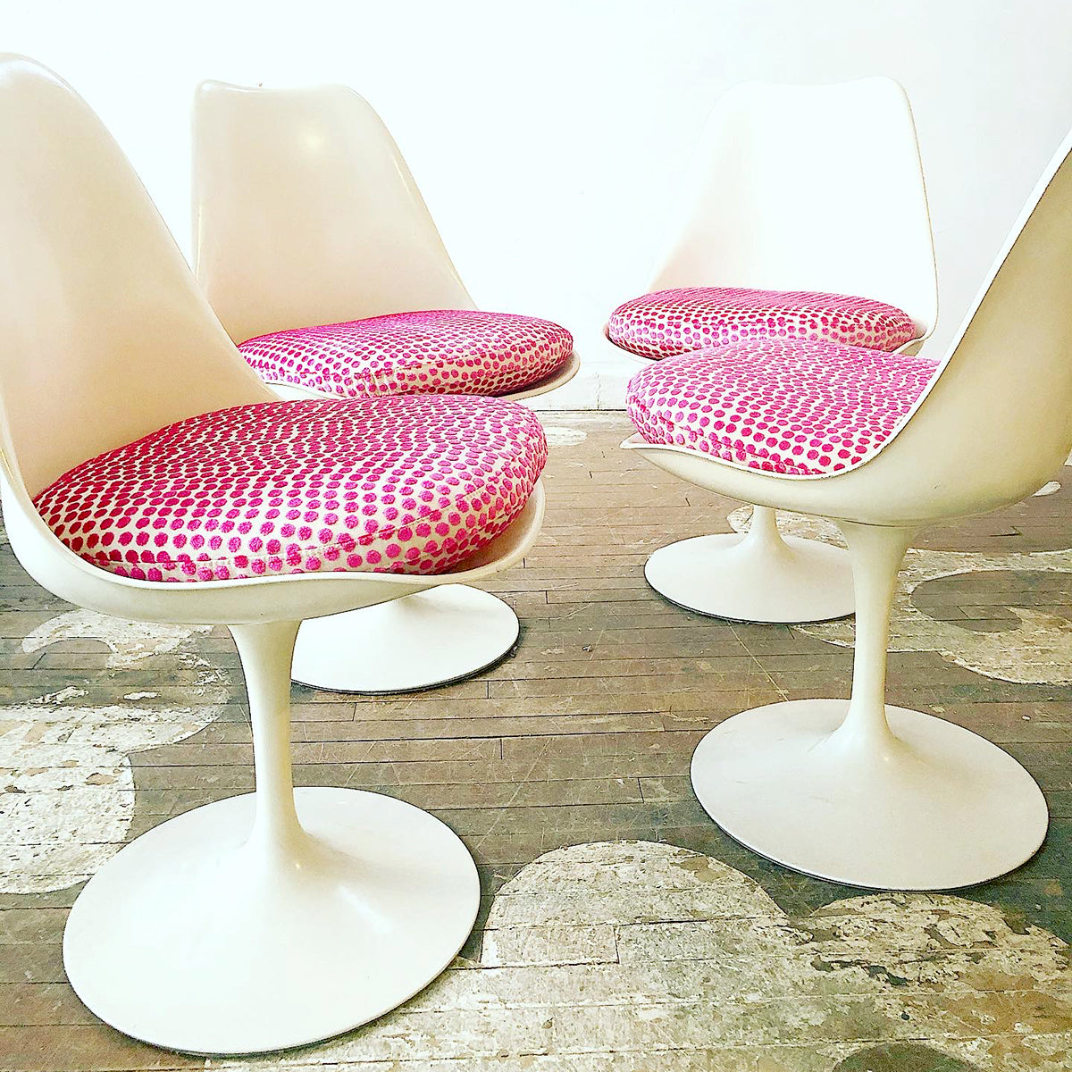 Classic Tulip Chairs designed by Eero Saarinen. I added my own personality on the cushions by using Dora in Fuschia, a velvet dotted fabric from Le Maison Pierre Frey brand Boussac.
